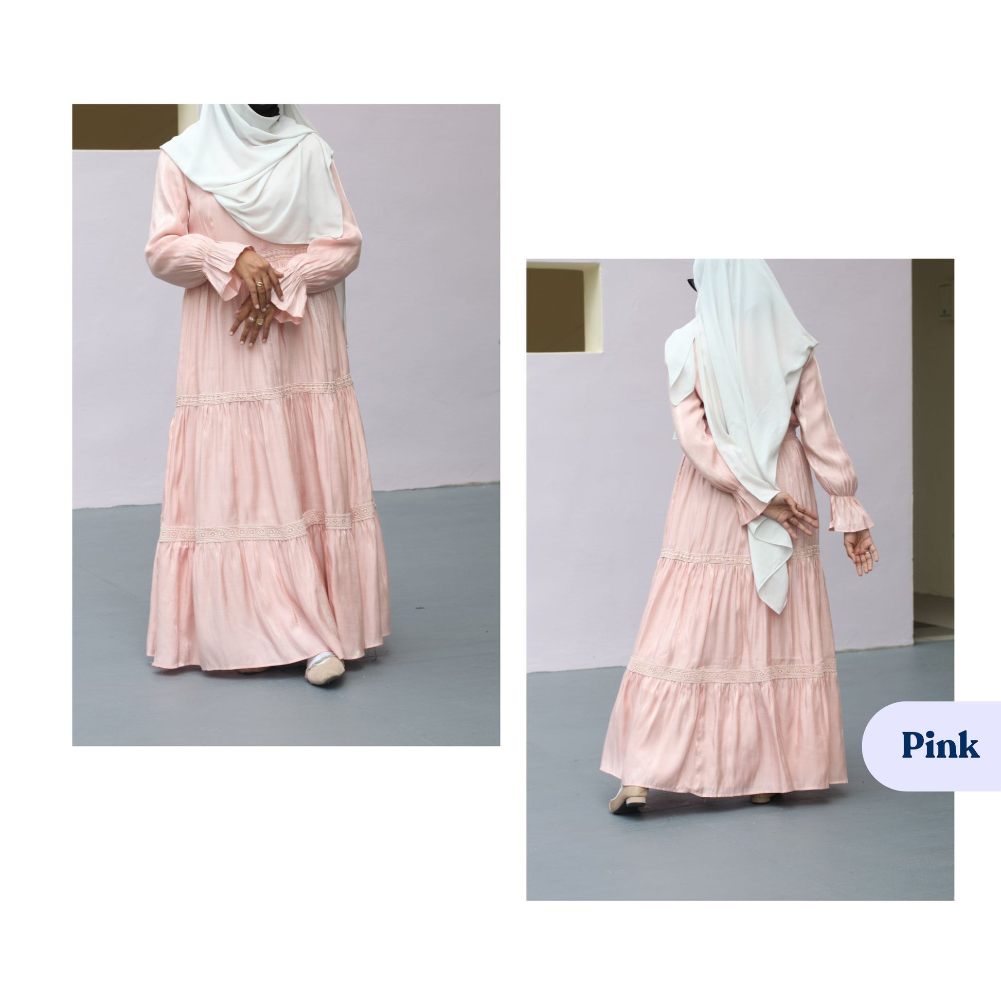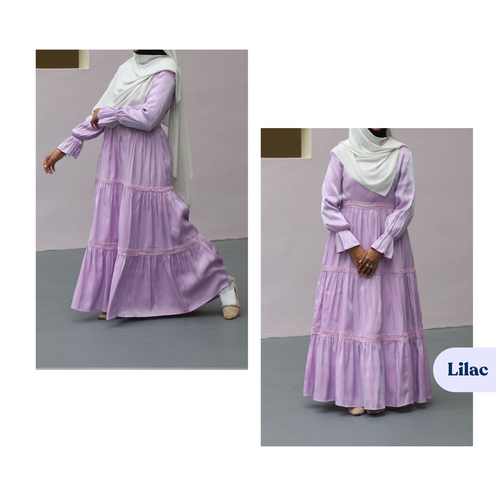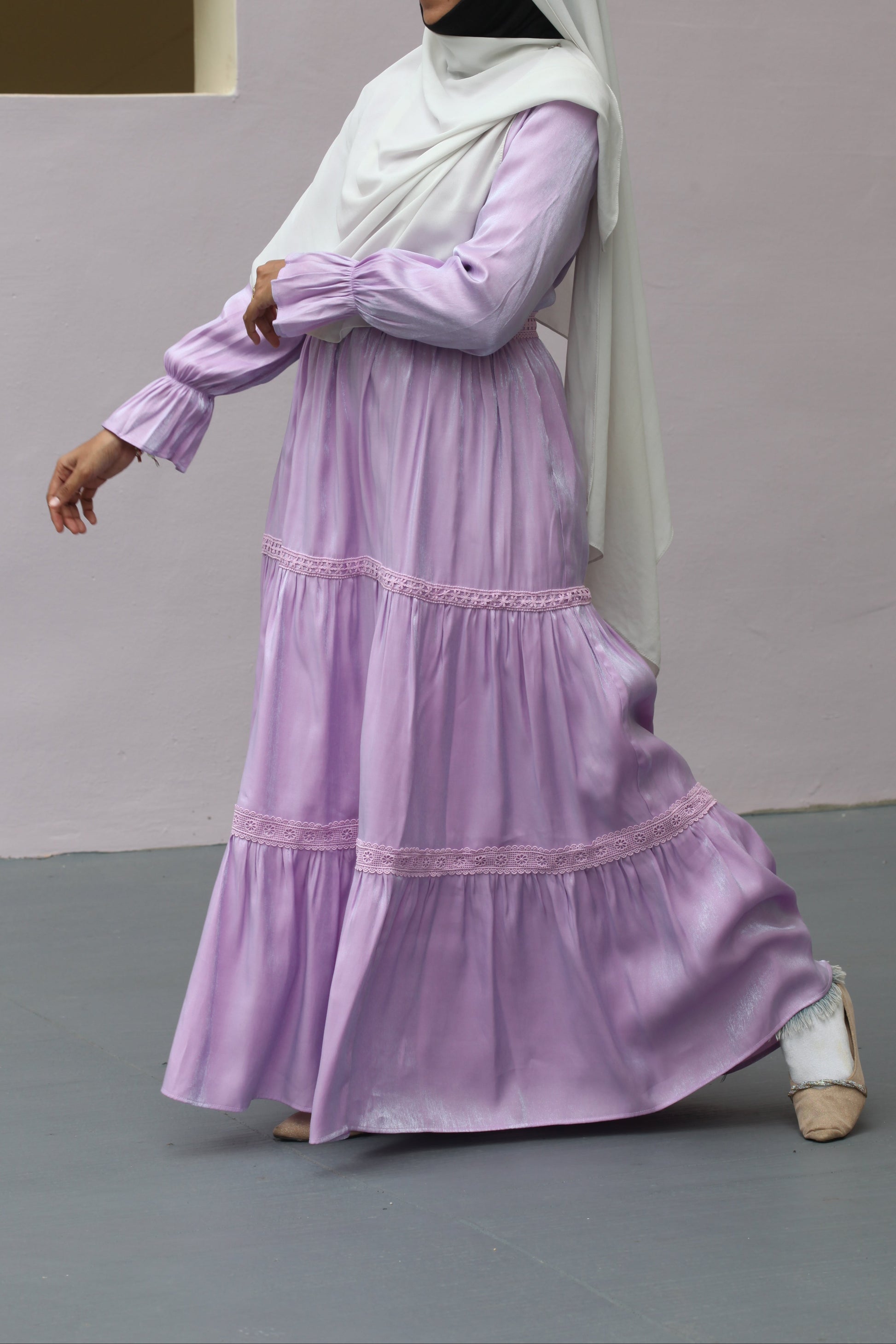 Intricate lace detailing and tiered layers elevate the design, while the subtly flared sleeves bring a romantic, vintage-inspired touch. Whether styled for a special occasion or an elegant everyday look, this dress is the epitome of charm and femininity. Pair it with a matching hijab and classic accessories for a truly refined ensemble.