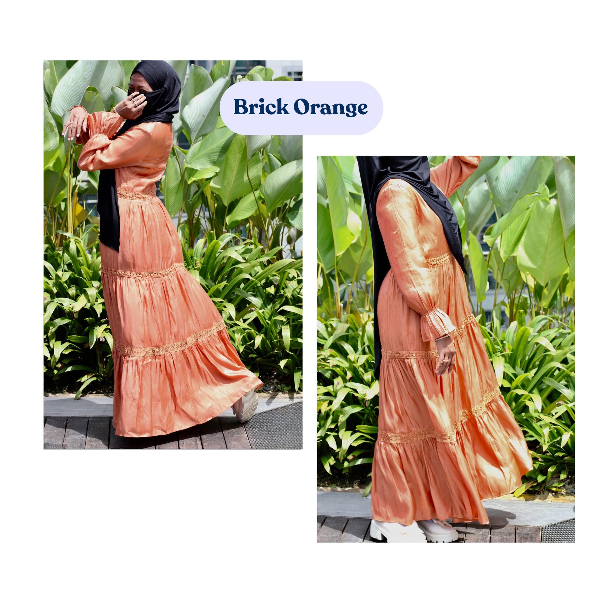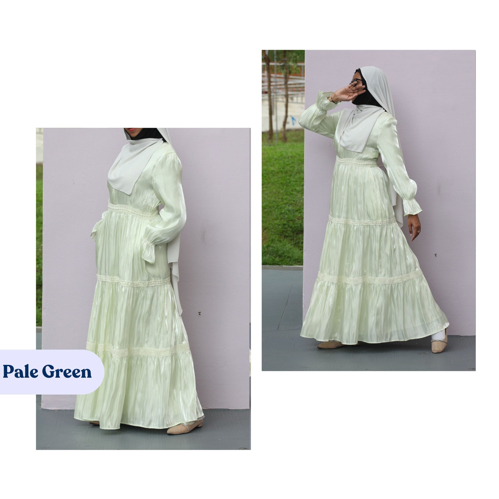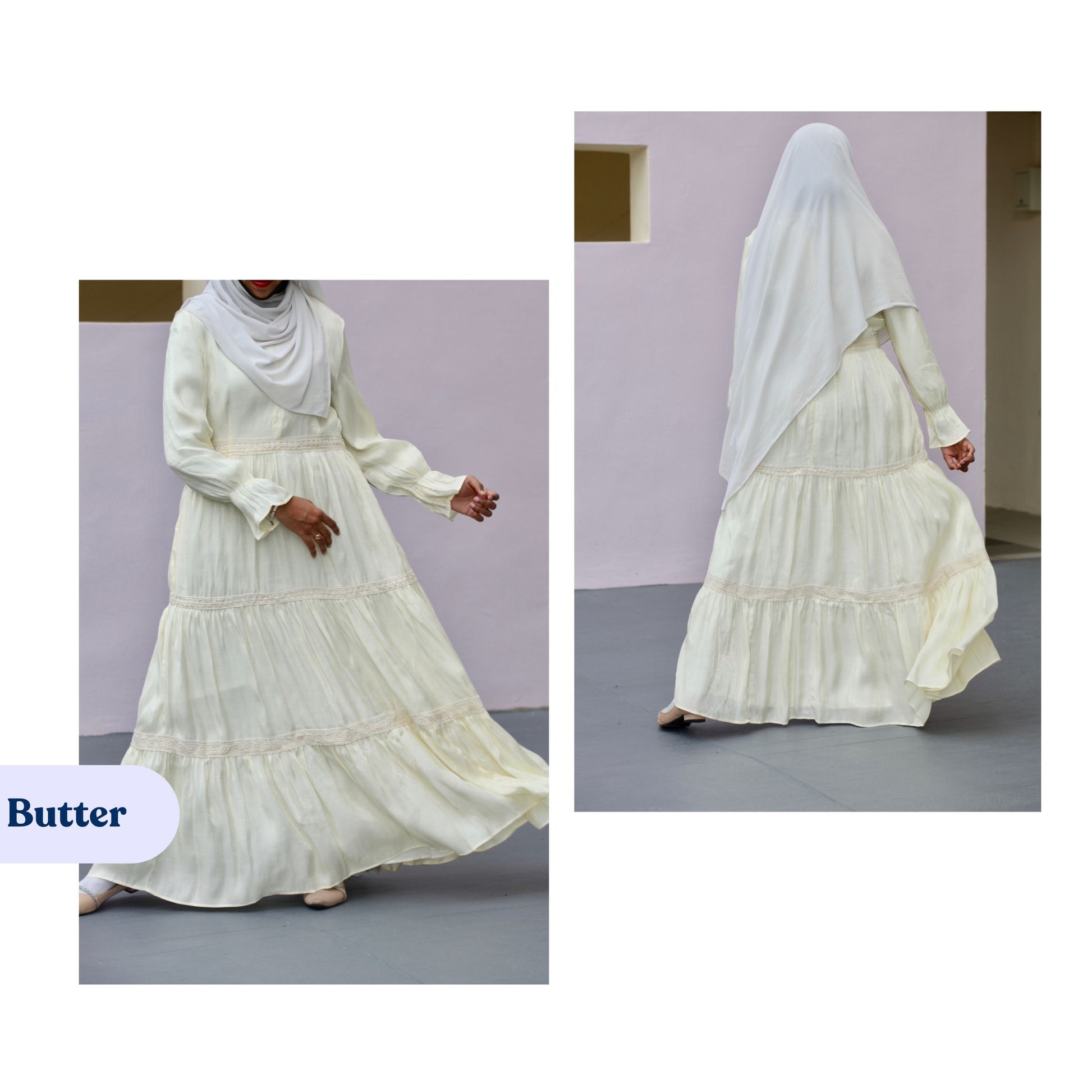 Intricate lace detailing and tiered layers elevate the design, while the subtly flared sleeves bring a romantic, vintage-inspired touch. Whether styled for a special occasion or an elegant everyday look, this dress is the epitome of charm and femininity. Pair it with a matching hijab and classic accessories for a truly refined ensemble.