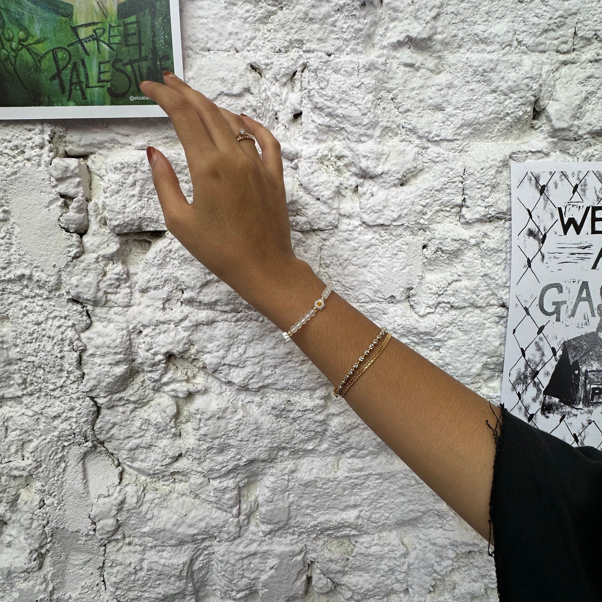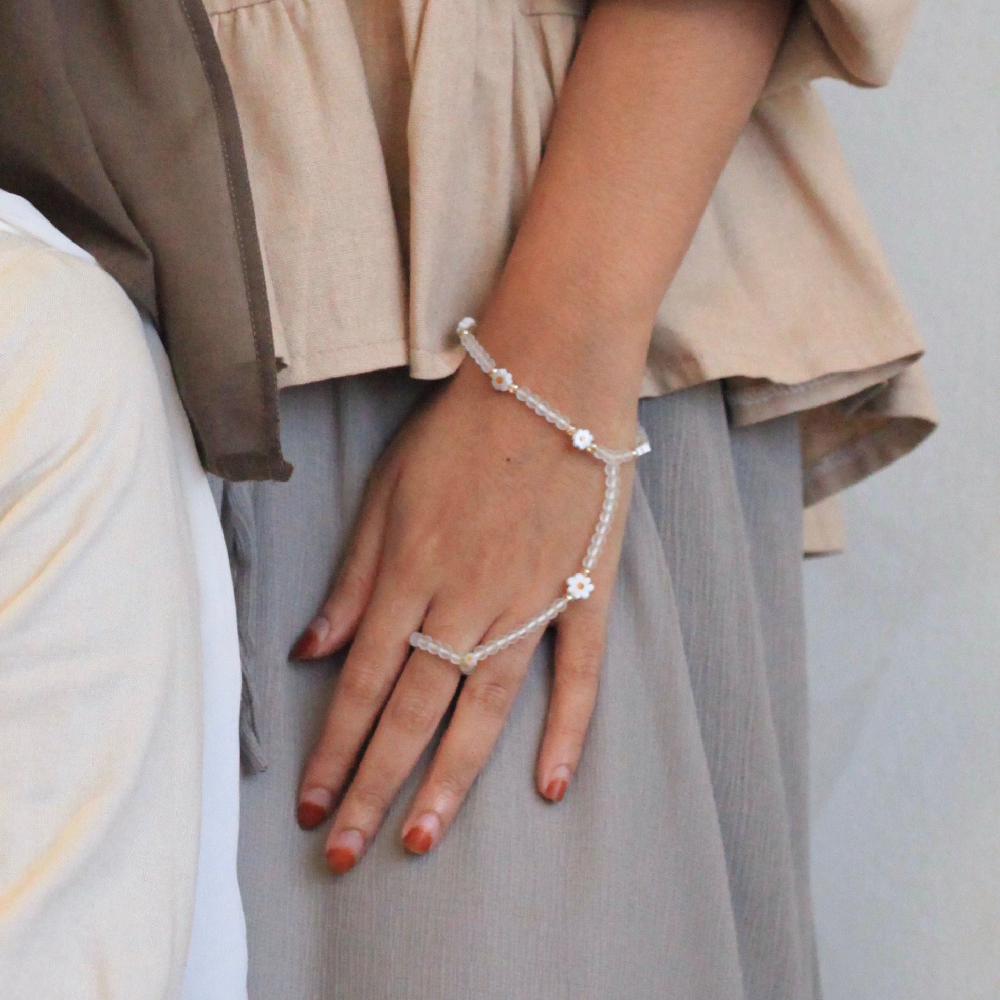 A gentle loop of frosted beads and blooming daisies, forming a quiet constellation around your wrist. It sways softly with your movement, delicate yet grounding, perfect for everyday sweetness or paired with your favourite stacks.