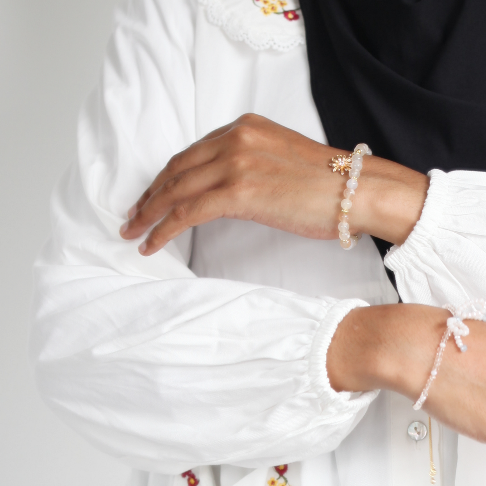 Made with soft, milky beads that glow gently under the light, it’s finished with a tiny daisy charm — warm, golden and delicately detailed — symbolising hope, softness, and quiet joy.