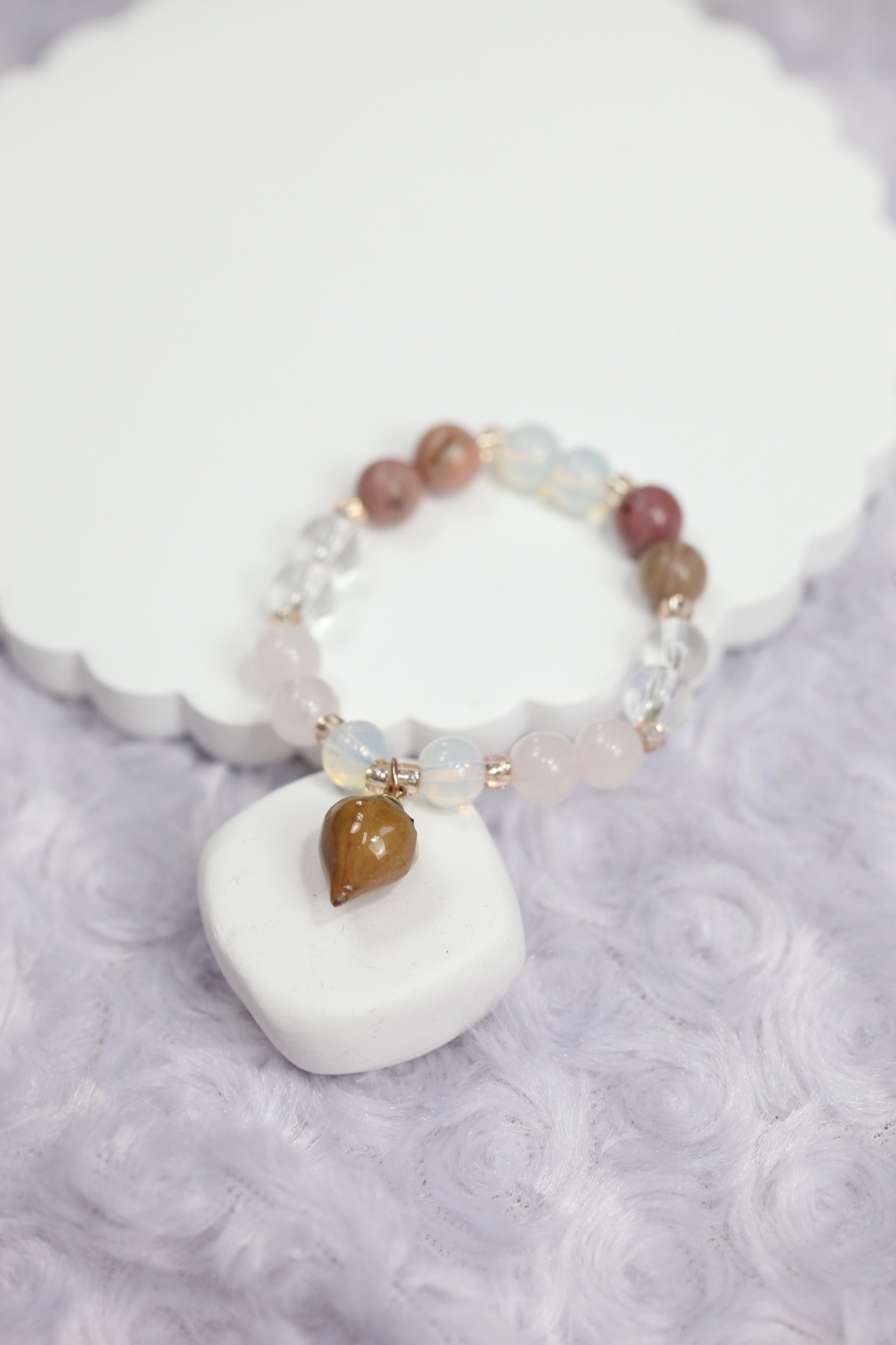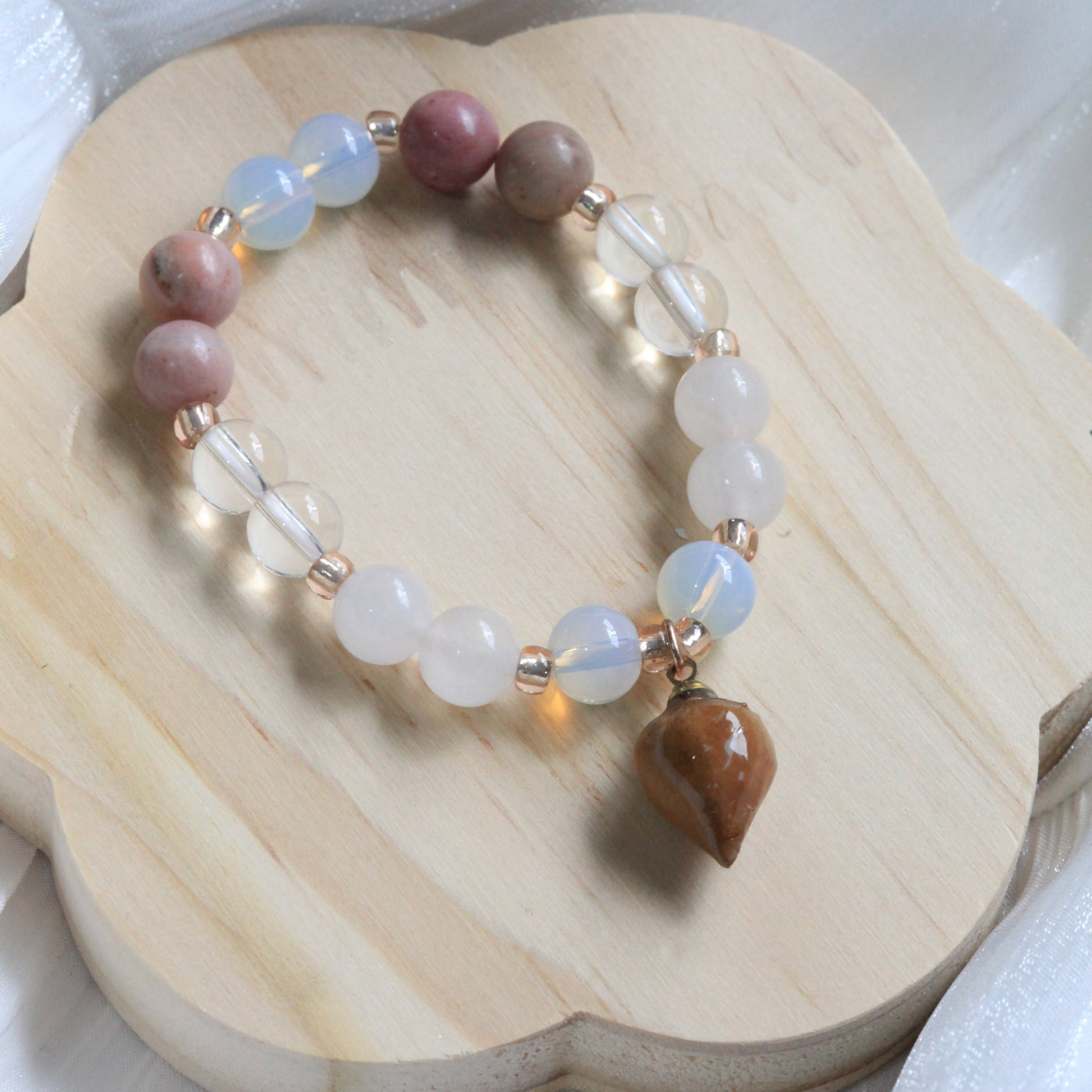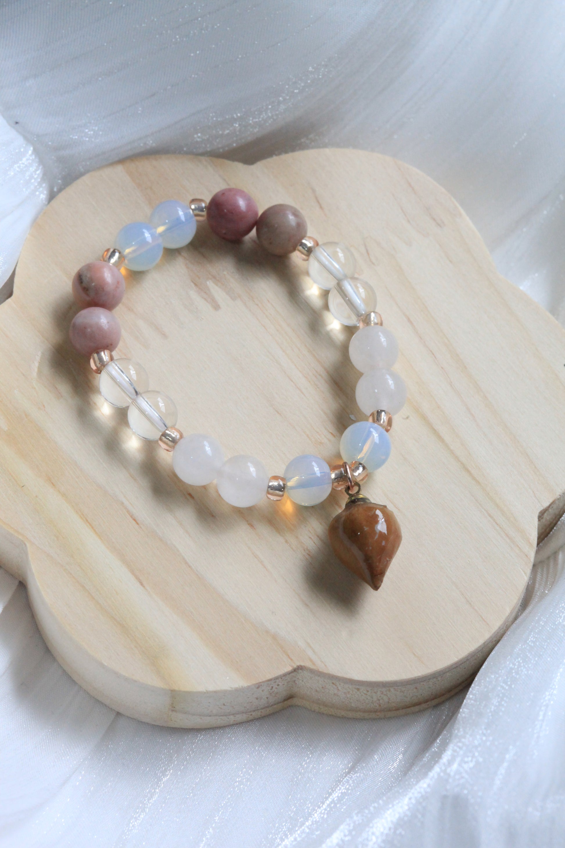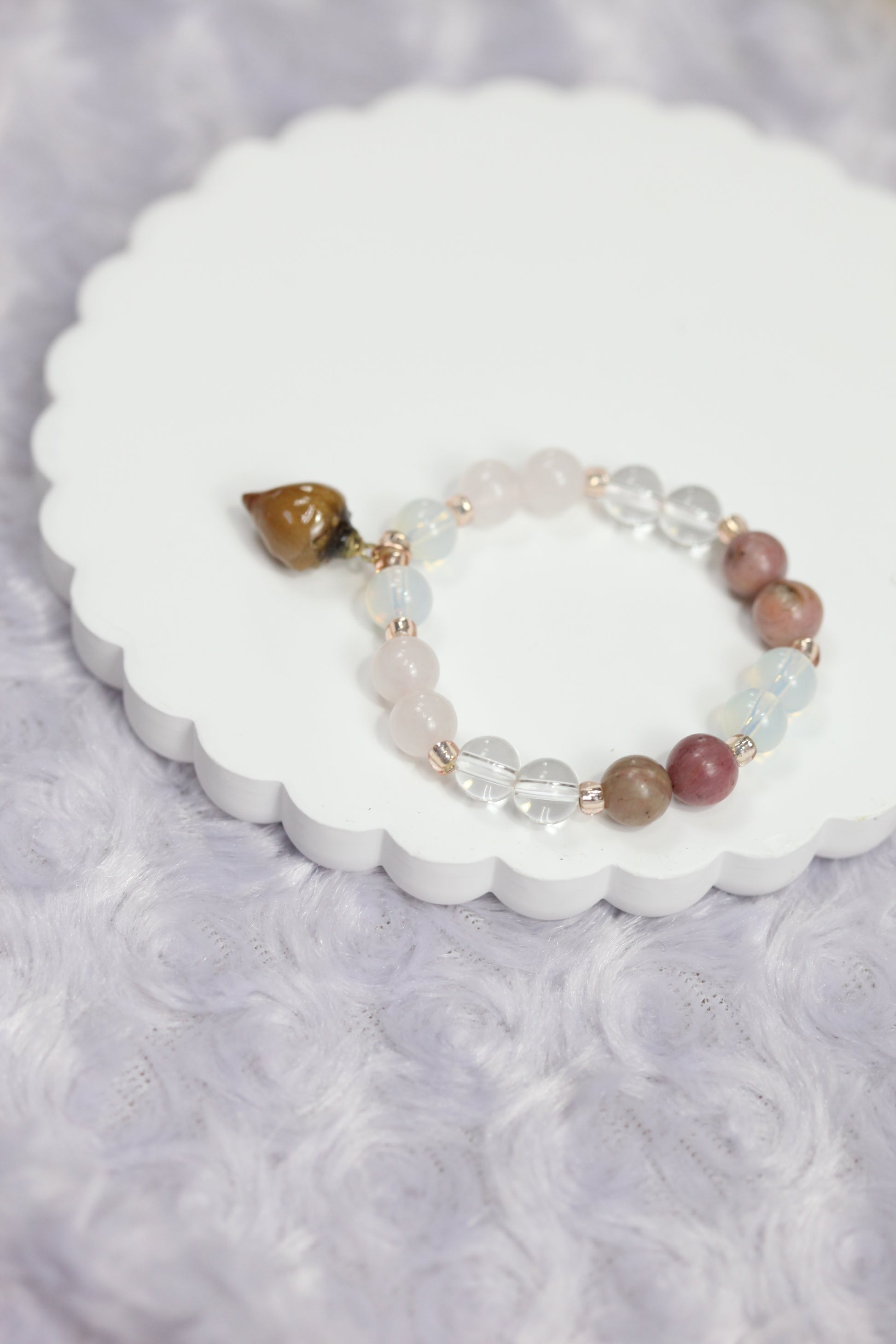 This bracelet carries the tender warmth of soft-spoken strength; the kind that doesn't rush, but stays. Blush-toned stones flow like a slow sunrise, layered with love, memory, and moments unspoken.