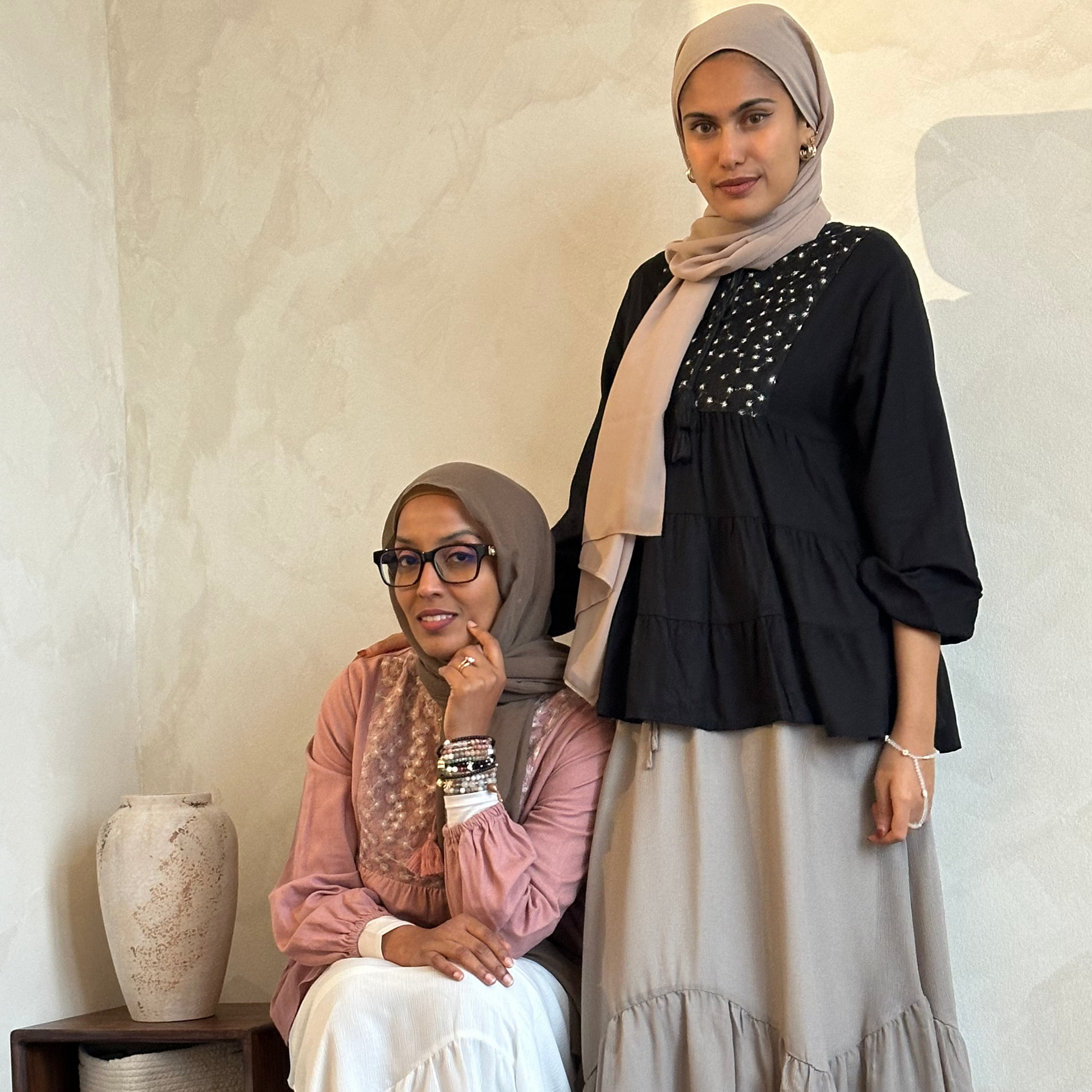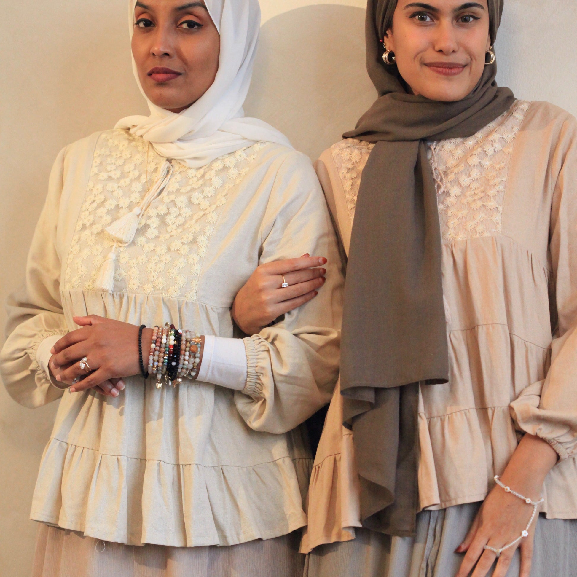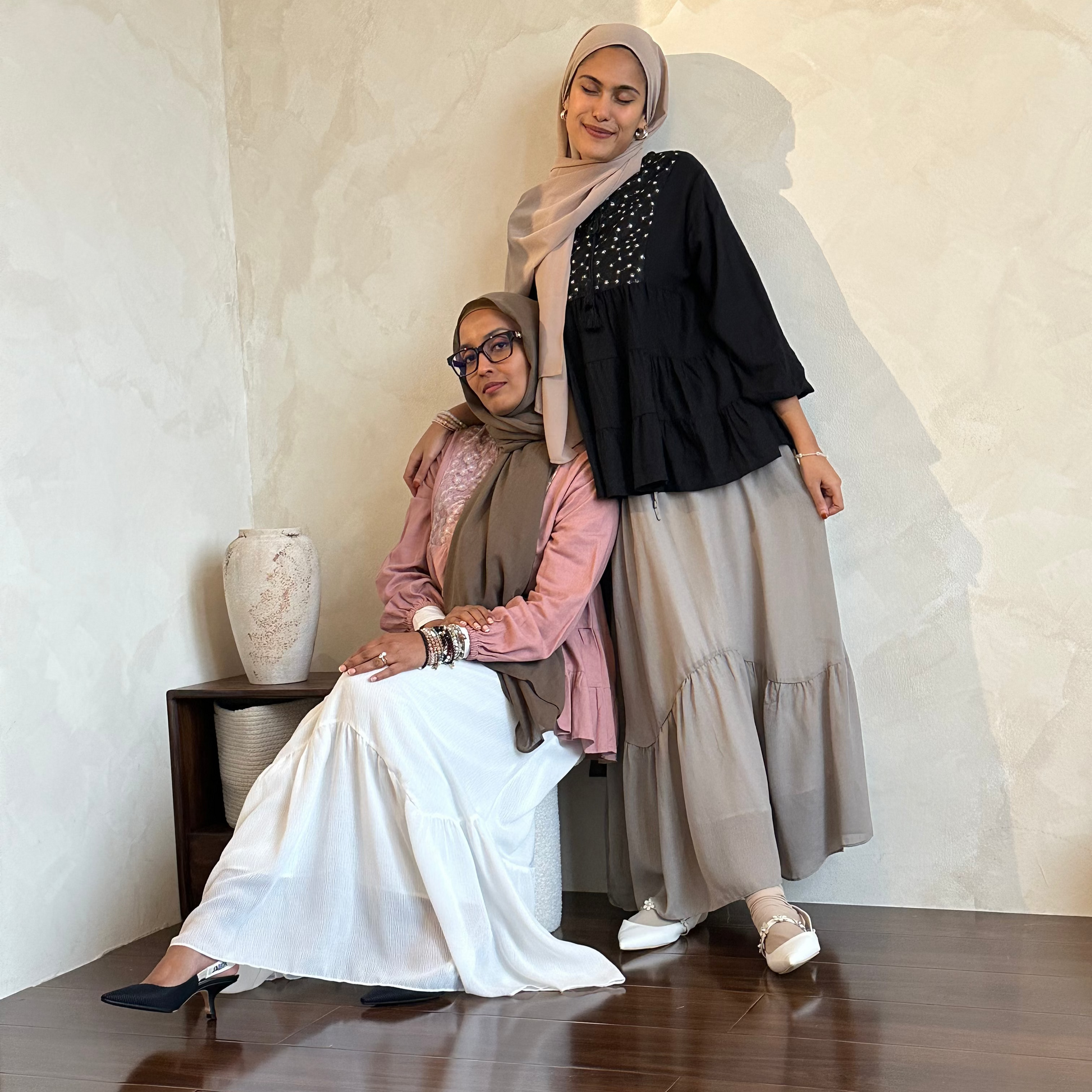 Relaxed silhouette with softly tiered drape for modest, graceful flow