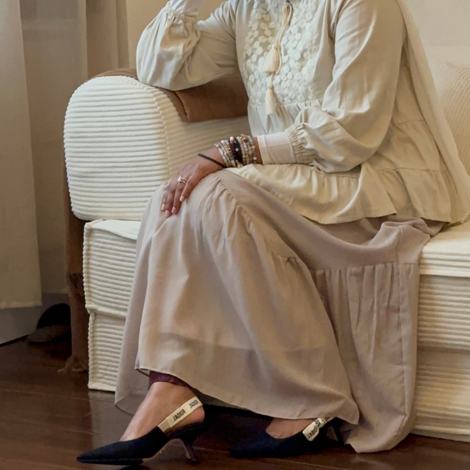 This is the skirt for the woman who finds beauty in stillness. She moves with intention, not urgency; with quiet conviction, not noise. She knows that peace is not something chased - it is something returned to. And as she walks, Wispy Solace mirrors her calm, reminding her of the strength that lives in softness.